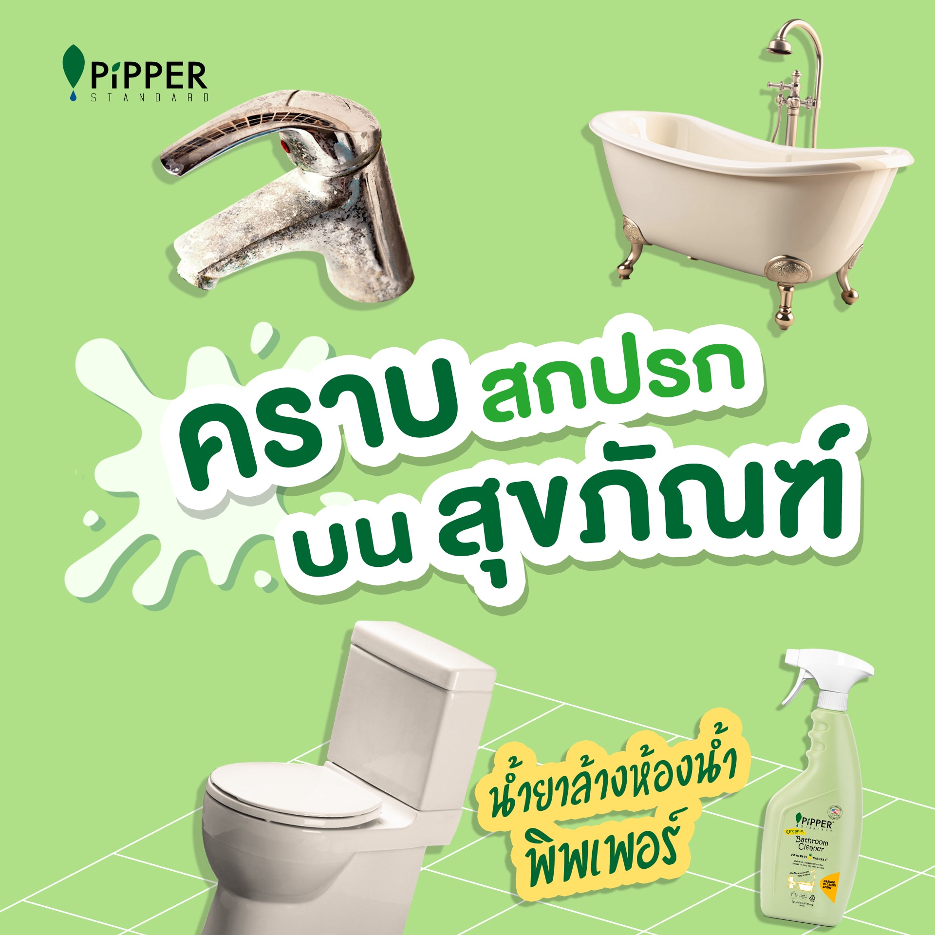 ประสบการณ์ใหม่ในการทำความสะอาดล้างห้องน้ำที่ไม่มีกลิ่นฉุน แสบตาหรือแสบจมูก ผลิตภัณฑ์ทำความสะอาดห้องน้ำ พิพเพอร์ สแตนดาร์ด ปราศจากสารก่อภูมิแพ้และไม่ระคายเคือง