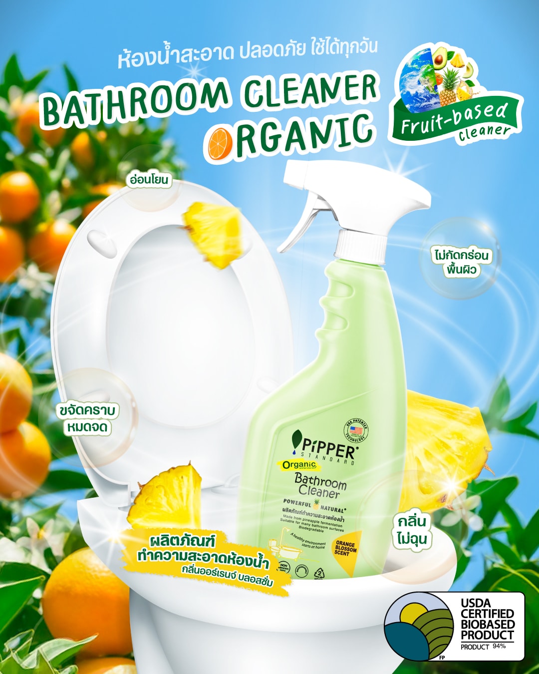 น้ำยาล้างห้องน้ำกลิ่นไม่ฉุน สูตรฆ่าเชื้อแบคทีเรีย และ กลิ่นออเร้นจ์ บลอสซั่ม จาก พิพเพอร์ สแตนดาร์ด